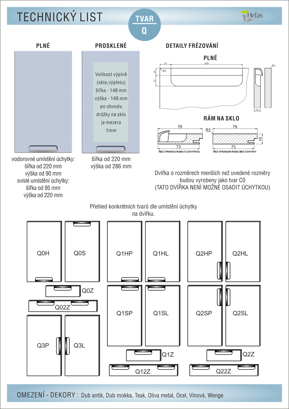 Tento tvar nabízíme se zafrézovanou úchytkou v provedení chrom mat, při objednání upřesněte její umístění (Q0H, Q3L, Q2SP, atd.)-viz obrázek na levé straně. Radius na hraně jsou 3 mm.