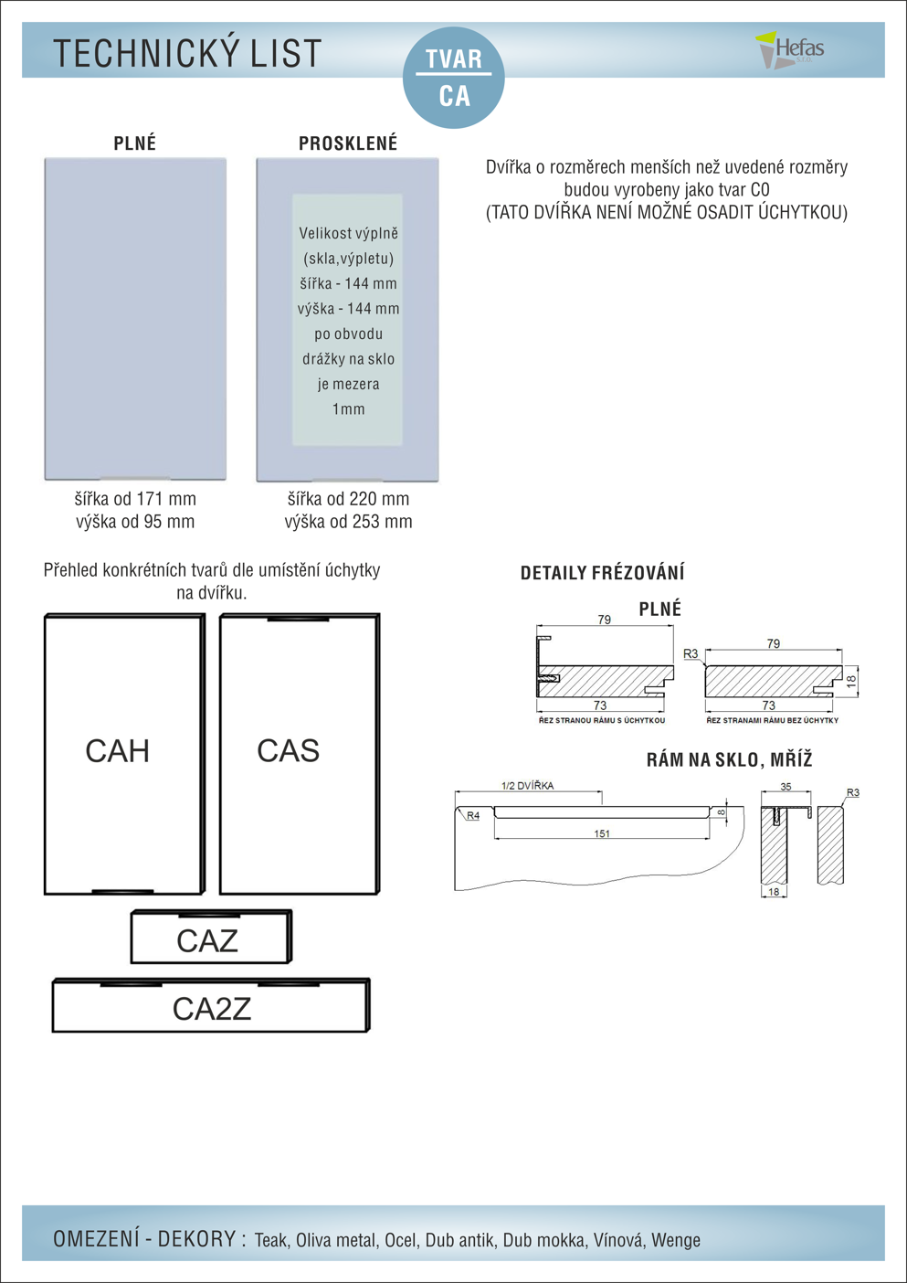 Tento tvar nabízíme se zafrézovanou úchytkou na hraně v provedení nikl mat, při objednání upřesněte její umístění (CAH, CA2Z, atd.)-viz obrázek na levé straně. Radius na hraně jsou 3 mm.