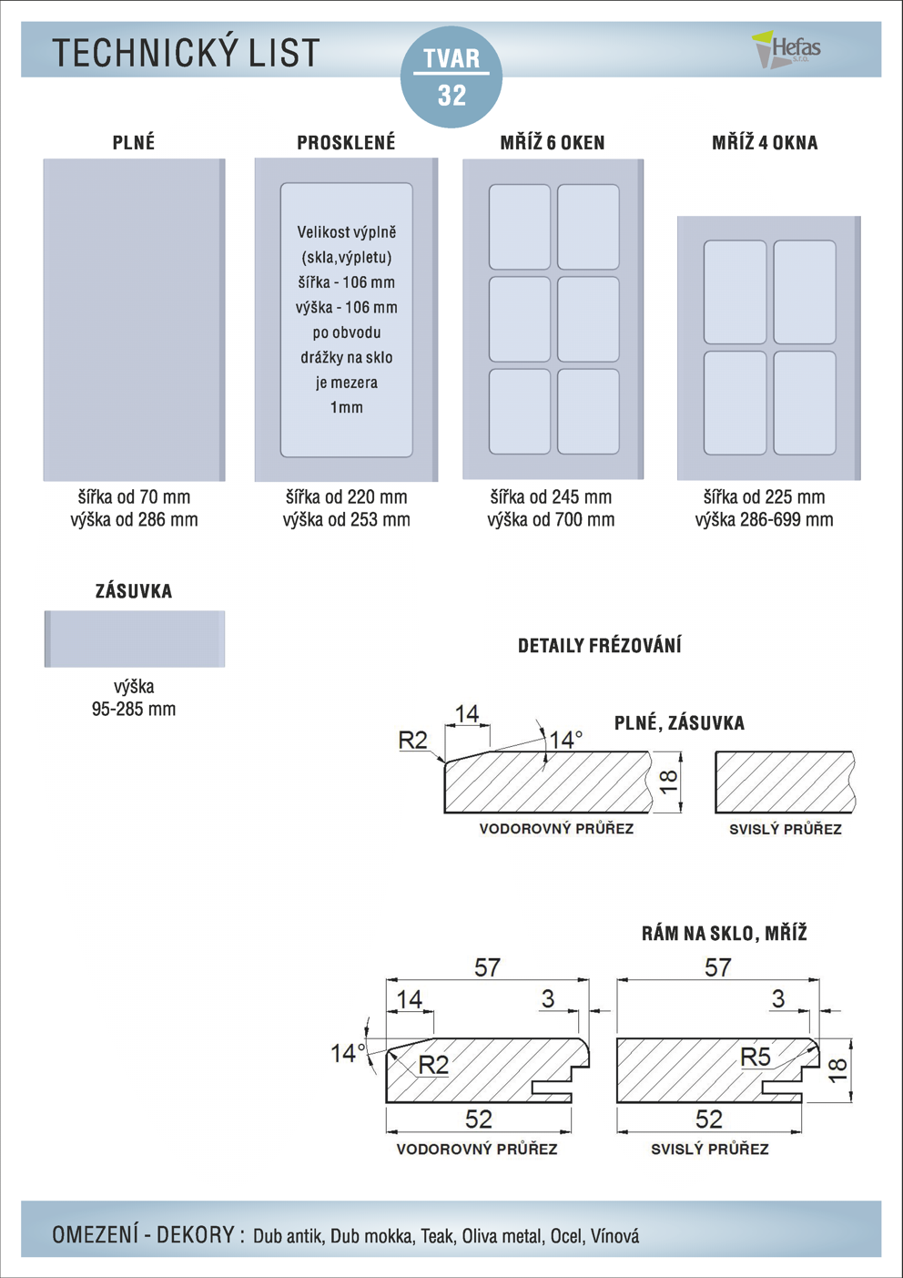Tento tvar se nedoporučuje kombinovat s následujícími fóliemi : Dub antik, Dub mokka, Teak, Oliva metal, Ocel a Vínová. (Viz záložka ke stažení, Nedoporučené kombinace dekor-tvar)